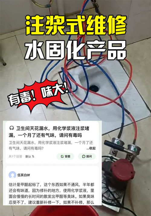 1、注漿液大多數為“水固化”該產品遇水溶脹,失水就收縮,原本堵上的地方過了不久后就會收縮脫落,不僅問題沒解決,瓷磚上還多了兩個難看的孔洞;